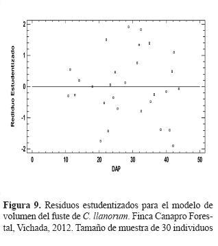 Un modelo multiplicativo fue escogido para calcular el volumen del fuste; este utiliza como variable dependiente el dap medido en centímetros; además, el comportamiento de los datos de volumen del fuste (m3) contra dap (cm) indica que no hay cambios drásticos en la curva del modelo, lo cual muestra una buena confiabilidad a lo largo de esta (figura 8). Por otro lado, no se evidenciaron residuos estudentizados mayores a 2, en valor absoluto, lo que supone que no hay valores atípicos en las estimaciones hechas con este modelo; tampoco se observa un patrón definido en los residuos (figura 9).