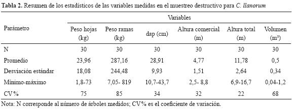 A cada árbol escogido le fueron registradas las variables en pie de dap, altura total y comercial, así como su localización; después de apeadas a cada árbol, se separaron las hojas (biomasa de hojas Bh), las ramas (biomasa de ramas Br) y el fuste (biomasa del fuste Bf); posteriormente, se agruparon los diferentes tipos de ramas, así como las hojas para registrar su peso; también se registraron las longitudes y los diámetros de los tocones, al igual que la longitud total de los fustes medidos desde la altura del tocón hasta la rama más larga (altura total) y la longitud desde la base del árbol hasta la primera bifurcación (altura comercial); después de conocer la longitud total de los fustes, estos se dividieron en 10 secciones iguales para registrar su peso y los diámetros al inicio, al centro y al final de cada troza para establecer su volumen, así como los cocientes de forma y el factor de forma verdadero para la especie; después de hallado el factor de forma para C. llanorum, se procedió a calcular el volumen en pie para todos los individuos muestreados en el inventario forestal.