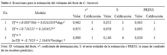 Posteriormente, se realizaron los análisis de correlación de Pearson (r) para las variables dasométricas medidas en el muestreo destructivo y los datos de biomasa; de esta manera, se identificaron las variables a relacionar en los modelos; se ensayaron 27 modelos de regresión, a partir de los cuales se seleccionaron los más favorables desde el punto de vista de su calidad estadística para futuras estimaciones; para ello, se consideraron los coeficientes de determinación (r2), el error estándar de las estimaciones (S) y la suma de cuadrados de los residuos predichos (PRESS).
