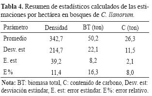 Los valores estimados para la biomasa y carbono contenidos en los bosques de C. llanorum fueron 50,2 y 26,3 ton.ha¯¹, respectivamente, los valores se observan en la tabla 4.
