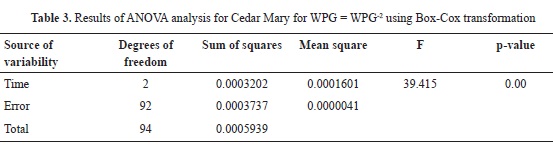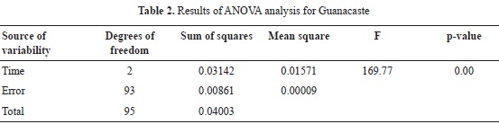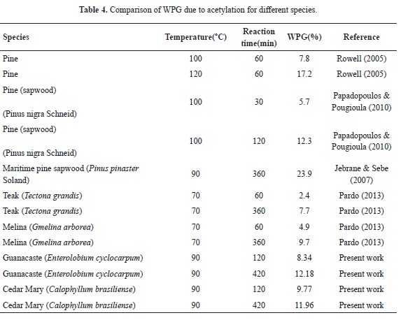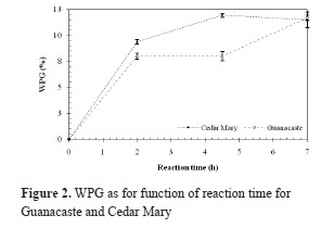 Mean WPG for 2, 4,5 and 7 hours of reaction for Guanacaste wood are 8.34, 8.35 and 12.18% respectively; in the case of Cedar Mary wood, mean WPG are 9.77, 12.44 and 11.96%. In both cases, values are relatively low, when compared to WPG of softwood species reported in the literature, as presented in Table 2. When compared to other hardwood species (Teak and Melina), Cedar Mary and Guanacaste have higher WPG as shown in Table 2.