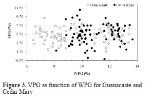 As shown in Figure 3, VPG due to acetylation does not have a particular trend with WPG for both species; however, VPG in Guanacaste increases with reaction time until a maximum mean value of 6.23% is obtained for 7 hours of reaction. On the other hand, VPG for Cedar Mary increases with reaction time as well, but a maximum mean value of 6.84% is reached at 4.5 hours of reaction and beyond that time a decrease in WPG is observed.