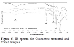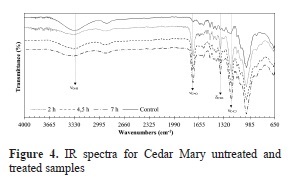 For both species, the untreated (control) samples in Figures 4 and 5 exhibit a strong signal at wavenumbers between 3333 cm-1 and 3336 cm-1, which is characteristic of stretching vibrations of OH present in lignin, cellulose and hemicellulose. Also the asymmetric stretch band that is characteristic of sp3 carbons in methyl group (Yurkanis, 2006) is present.