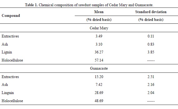 Samples were prepared of C. brasiliense wood obtained from the Atlantic region in Costa Rica and E. cyclocarpum wood obtained from North Pacific region in Costa Rica. Sawdust from both species was prepared for chemical characterization using standard method TAPPI: T-264 om-88. Acid insoluble lignin content was determined using standard method TAPPI: T-222 om-88 and ash content was determined using standard method TAPPI: T-211 om-93. Holocellulose (cellulose plus hemicellulose) was determined by difference.