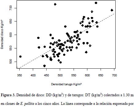 De acuerdo con los resultados obtenidos, la densidad basada en el tarugo fue 10% menor que la densidad de disco. Sin embargo, la relación entre las densidades por tarugo y disco fue de manera general razonable, con un coeficiente de determinación R2 de 0.4828 y un p-valor de 2.087e-15 (). En la figura 3 se representan todos los individuos muestreados con sus respectivos valores para densidad por disco y por tarugo.