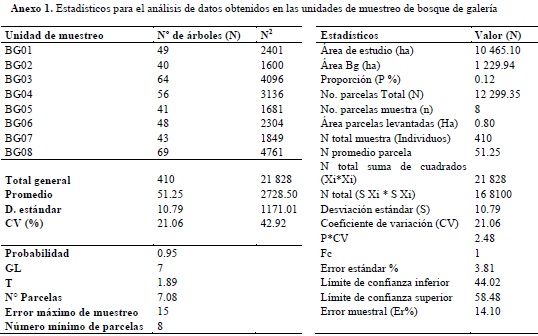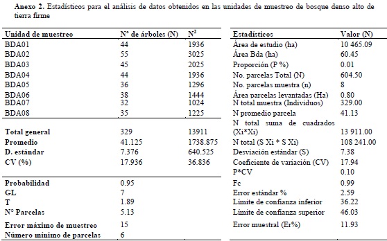 Se empleó un muestreo aleatorio estratificado (Melo & Vargas, 2003), donde se dividió la población en dos estratos (los dos ecosistemas en estudio), en los cuales se tomaron muestras al azar. Para ello fue empleado el mapa de coberturas donde se seleccionaron los sitios potenciales para la realización de los pre-muestreos mediante la elaboración cartográfica de una malla de puntos para cada unidad de análisis. Posteriormente, se hizo la selección, completamente al azar, de los puntos para el levantamiento de las parcelas en la fase de campo. Para realizar la comparación entre unidades de muestreo y comprobar que la información es representativa de la muestra, se tomó como variable el número de individuos, con el fin de procesar la información a una probabilidad del 95% y error de muestreo inferior al 15%. Los resultados del análisis de datos para calcular el tamaño de la muestra en bosque de galería y bosque denso alto de tierra firme, se encuentran consignados en los anexos 1 y 2, respectivamente.