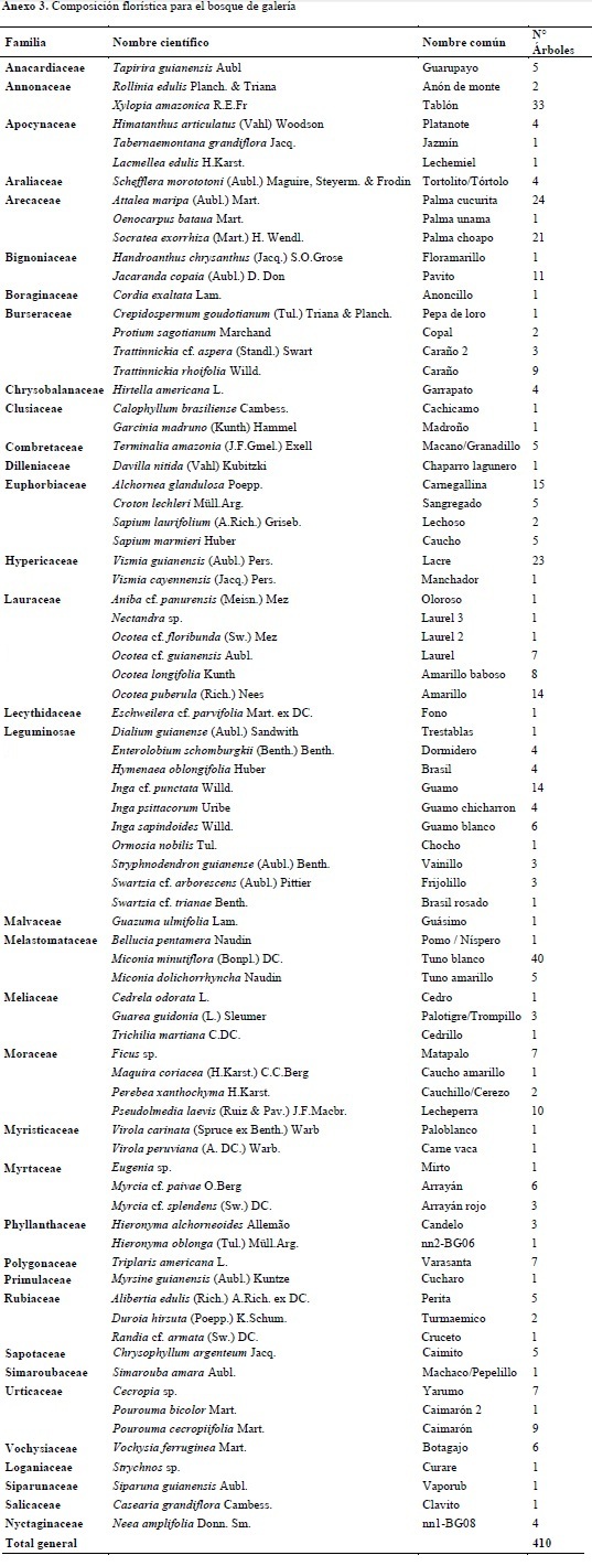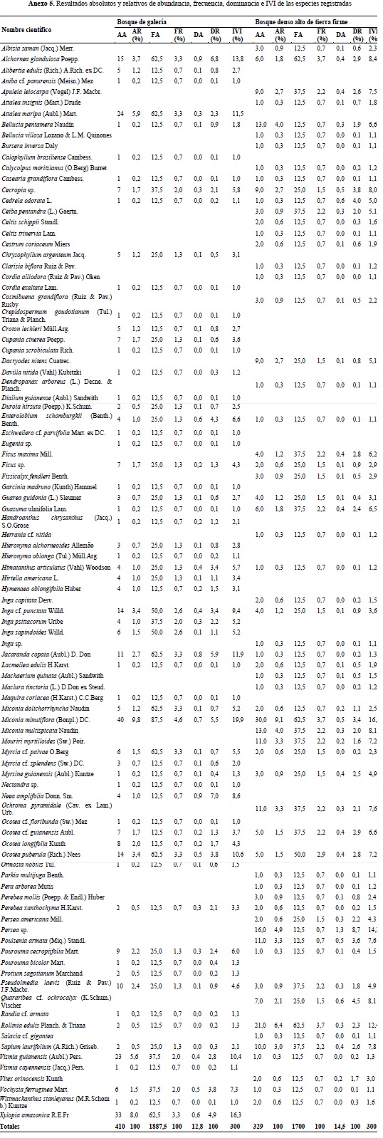 Este estudio comparativo permite concluir la gran similitud que existe entre bosques de galería y bosques densos, ya que los segundos, en algunos casos, son el resultado de la fragmentación de los primeros, dejando como consecuencia parches de bosques aislados y sin una conectividad ecosistémica con las áreas que continúan manteniendo mayores regímenes de inundación, es decir con los actuales bosques de galería. Esta interpretación se encuentra sustentada, además, en los resultados obtenidos mediante el test U de Mann-Whitney, donde no se encontraron diferencias significativas en los índices analizados; no obstante, fue posible establecer que estos procesos de fragmentación y las características propias de los tipos de bosque analizados, especialmente las asociadas a los regímenes de inundación, influyen en la abundancia de algunas especies tolerantes a niveles freáticos altos como A. maripa en bosque de galería y sin presencia en los bosques densos.