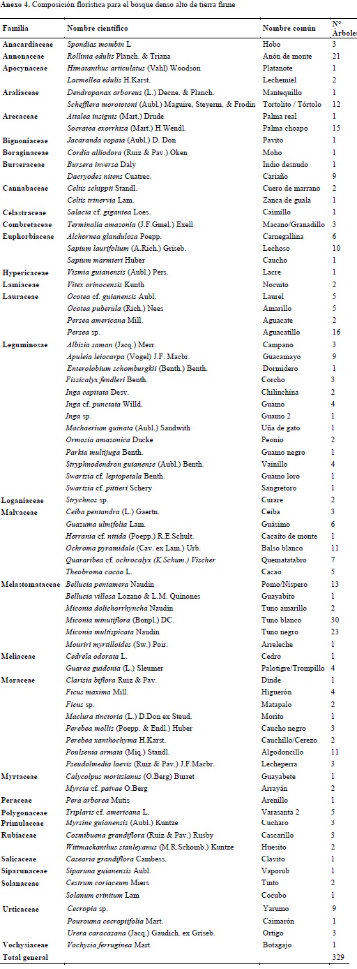 El perfil de vegetación del bosque denso alto de tierra firme permite diferenciar una significativa abundancia de elementos que se mantienen en una altura promedio de 15 metros, donde se destacan especies como Guazuma ulmifolia (Guásimo), Sapium marmieri (Caucho) y M. minutiflora; en el estrato inferior se encuentran especialmente individuos de T. cacao, lo cual confirma la información suministrada por los pobladores locales, quienes señalan que varios de estos bosques se originaron a partir de cultivos de cacao abandonados, suposición completamente válida si se considera que estos pueden coadyuvar en el crecimiento de la vegetación nativa al facilitar el desarrollo de las dinámicas de la sucesión natural temprana; dicha especie se encuentra acompañada por individuos de Alchornea glandulosa (Carnegallina), G. ulmifolia y otras del género Miconia. El estrato superior está dominado por las especies O. puberula, A. leiocarpa y especialmente por un individuo de C. odorata con más de 30 metros de altura.