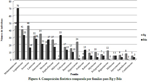 La comparación del número de individuos por familia taxonómica permite establecer una clara dominancia de la familia Melastomataceae en ambos ecosistemas, con un total general de 116 registros, siendo más abundantes en el ecosistema de Bda (70) y en segundo lugar de importancia se destaca la familia Leguminosae con una riqueza específica de 74 individuos, de los cuales 41 se reportaron en Bg y 33 en Bda. Estas familias concentran el 25.71% del total de individuos inventariados, lo cual concuerda con las investigaciones realizadas por Carvajal & Murillo (2007), en su análisis florístico y fitogeográfico del sector nororiental de la Sierra de La Macarena, donde reportan a la familia Melastomataceae como una de las más diversas y abundantes en bosques de galería y bosques de tierra firme poco intervenidos, al igual que lo planteado por Duque et al. (2003).
