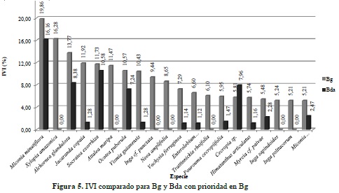 En términos generales, y a pesar de no encontrar diferencias significativas en la biocenosis de estos dos ecosistemas, el análisis de la estructura horizontal permite establecer una clara divergencia entre el peso ecológico de las especies halladas en los inventarios; también se evidencia en la presencia-ausencia de algunas especies en un ecosistema y en otro, situación que puede darse principalmente por las características y disponibilidad de factores y recursos para el desarrollo de la vegetación en cada unidad de análisis, e indiscutiblemente por la intervención directa del hombre para el desarrollo de sus actividades productivas; es el caso de especies con una importancia ecológica considerable en Bg como lo son X. amazonica, A. maripa y Neea amplifolia, pero que no aparecen dentro de las más relevantes en Bda, mientras que Persea sp., Miconia multispicata y Quararibea cf. ochrocalyx, alcanzan un IVI por encima del 8% en Bda y no aparecen dentro de las más importantes en Bg. Este hecho puede estar asociado a las dinámicas de disponibilidad del recurso hídrico en ambos ecosistemas, con mucha mayor abundancia en bosque de galería, donde, por ejemplo, A. maripa se posiciona como una especie tolerante a periodos de inundación y muy abundante en bosques de ribera, según lo planteado por Díaz et al. (2010), en su estudio sobre composición florística del bosque ribereño del río San José, Reserva Forestal de Imataca, Estado Bolívar, Venezuela, y confirmado los resultados de Mostacedo et al. (2006), quienes establecen que A. maripa se encuentra dentro del 25% de las especies arbóreas raras en bosque alto.