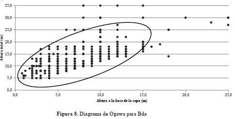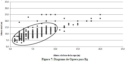 Se empleó el método cuantitativo de descripción de la vegetación propuesto por Ogawa, confeccionando una gráfica con las alturas totales en las ordenadas y las alturas a la base de la copa en las abscisas; la aparición de enjambres de puntos más o menos aislados, indica el virtual vacío de las copas en los niveles intermedios, sugiriendo un número de estratos diferenciales en el perfil del bosque. Cuando se genera una sola nube de puntos alargada y con pendiente positiva, no se pueden diferenciar estratos, ya que existe una continuidad de puntos desde el sotobosque hasta el dosel (Unesco, 1980).