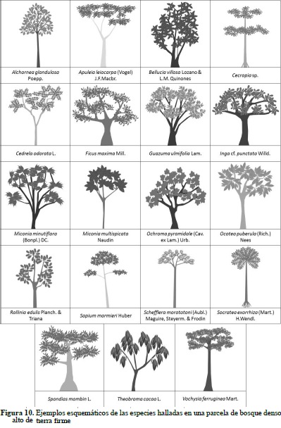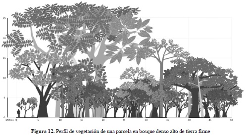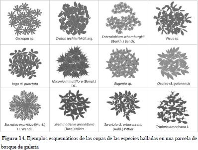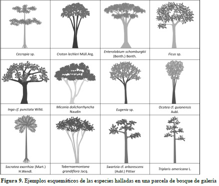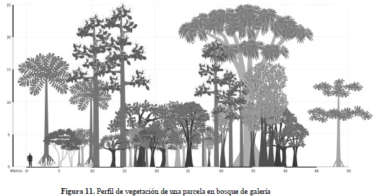 Los ejemplos esquemáticos de las especies registradas en las parcelas de Bg y Bda se presentan en las figuras 9 y 10 a manera de leyenda y los correspondientes perfiles de vegetación se ilustran en las figuras 11 y 12. El perfil de vegetación elaborado para el bosque de galería permite establecer un estrato inferior caracterizado por la presencia de individuos con alturas menores a los 8 metros, donde destacan especies como Eugenia sp. (Mirto), Siparuna guianensis (Vaporub), Swartzia cf. arborescens (Frijolillo), Tabernaemontana grandiflora (Jazmín) y M. minutiflora. El estrato medio cuenta con la presencia de individuos entre los 8 y 15 metros de altura, agrupando una menor cantidad de estos comparado con el estrato inferior; en este estrato la especie M. minutiflora continúa siendo una de las más características, junto con T. americana, X. amazonica y algunas especies del género Ocotea. En el estrato superior se aprecia un dosel irregular con individuos de 25 m de altura de las especies T. americana, E. schomburgkii y algunas palmas como A. maripa y S. exorrhiza.