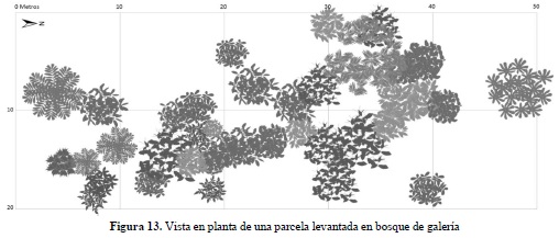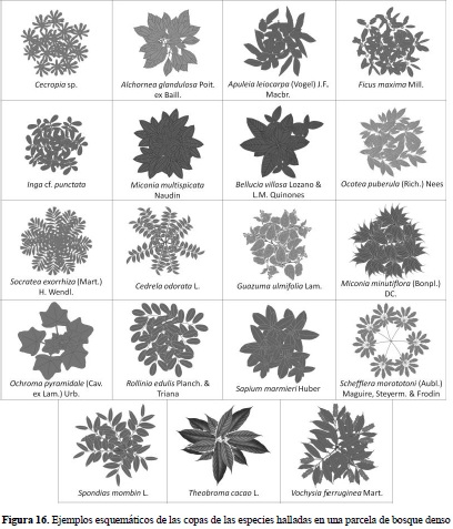 En el caso del Bg se puede apreciar que gran parte de los individuos se encuentran en alturas menores a los 10 metros; sin embargo, es posible diferenciar tres estratos arbóreos en estos bosques, donde predominan las especies M. minutiflora y Triplaris americana (Varasanta). En Bda se observa una estructura vertical mucho más alta y homogénea que la encontrada en el Bg, con elementos emergentes de gran porte representados por Ocotea puberula (Amarillo), Apuleia leiocarpa (Guacamayo) y Cedrela odorata (Cedro). Con el fin de facilitar la interpretación de los perfiles y la distribución de las especies en el espacio al interior de las parcelas seleccionadas en cada tipo de ecosistema, se presentan las vistas en planta (Figuras 13 y 15) con sus correspondientes leyendas que relacionan las especies con las formas de sus copas (Figuras 14 y 16).