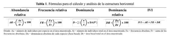 Consiste en determinar la frecuencia, área basal o dominancia, abundancia, e IVI de los individuos en la superficie del suelo (Becerra, 1971). Para el cálculo de estas variables se emplearon las fórmulas que se presentan en la tabla 1.