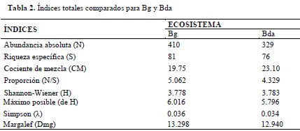 La proporción indica la relación entre la abundancia absoluta y la riqueza específica, señalando que en Bg es posible encontrar una especie por cada 5 individuos (1:5), mientras que en Bda se encuentra una especie por cada cuatro (1:4), confirmando de esta manera una mayor heterogeneidad para este último.