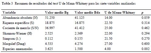 La aplicación del test estadístico reveló que existen diferencias significativas en el número de especies amenazadas, casi amenazadas y con preocupación menor entre ambos ecosistemas (U = 4; P = 0.002), con una probabilidad del 95% y con mayor significancia para el bosque de galería (Tabla 3).