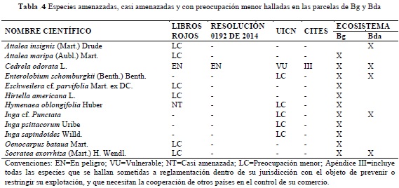 De acuerdo con las bases de datos consultadas para establecer la presencia de especies catalogadas en alguna categoría de amenaza, las casi amenazadas y en preocupación menor, fue posible encontrar un total de 12, de las cuales 11 están registradas en Bg y 5 en Bda (Tabla 4); dicha situación impulsa a considerar estos ecosistemas como áreas de interés para la conservación, ya que a pesar de encontrarse restringidos a los cursos de agua en el caso de los Bg, a pequeños relictos boscosos a manera de "islas" para el caso de Bda, y teniendo en cuenta su alto grado de fragmentación, en los dos se encontraron especies amenazadas. Por citar un ejemplo, en ambos ecosistemas se registraron individuos de C. odorata, especie catalogada En Peligro de extinción (EN) a nivel nacional según la Lista de Especies en Libros Rojos de Colombia, considerada como Vulnerable (VU) A1cd+2cd por la RedList de la UICN y Apéndice III en CITES.