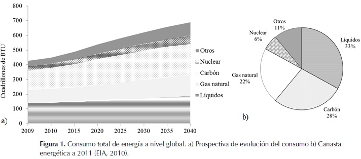 Integrar las plantaciones forestales comerciales en conceptos de biorrefinería contribuye a mitigar la problemática energética, ambiental y social causada por la energía de origen fósil. Se destaca que a nivel global en la última década se ha mejorado el rendimiento de los sistemas energéticos; sin embargo, el consumo de combustibles fósiles sigue aumentando (Figura 1). Según la Agencia de Administración de Información de la Energía de los Estados Unidos, en el 2011 el consumo energético global alcanzó los 531.2 cuatrillones de BTU (British Thermal Unit), con un crecimiento anual aproximado del 1.6%; crecimiento que se proyecta hasta el año 2035 debido al continuo aumento de equipos, procesos y máquinas que demandan energía (EIA, 2011). Una alternativa que promete reducir la dependencia de energéticos de origen fósil es la investigación y desarrollo de las fuentes de energía renovables. La biomasa contribuye con cerca del 14% del suministro de energía primaria global, y es considera la cuarta fuente energética (Lighong et al., 2010). Con el estudio e implementación de sistemas que operen con estas fuentes se puede diversificar la canasta energética, reducir la dependencia de los países que no disponen de suficiente energía primaria fósil para su autoabastecimiento y mitigar los impactos medioambientales ocasionados por el uso de combustibles de origen fósil, como el cambio climático (Ghatak, 2011; Lighong et al., 2010).