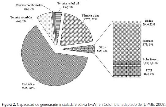 Cuando se piensa en la aplicabilidad de gasificación de biomasa con fines energéticos en Colombia, se encuentra que, debido a la gran disponibilidad de recursos hídricos en el país, solo se considera el potencial de la biomasa como fuente no convencional de energía en ZNI. Estas regiones no interconectadas corresponden al 52% del territorio nacional y son habitadas por cerca del 12% de la población Colombiana (UPME, 2010c). Según los últimos reportes de la UPME, la generación de energía con biomasa representa solo el 2.78% de la capacidad efectiva de generación en Colombia (Figura 2).