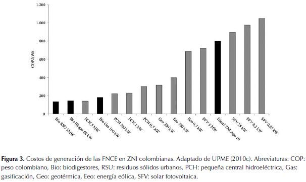 Teniendo en cuenta la baja densidad poblacional de las ZNI, la demanda energética localizada estaría en promedio por debajo de los 500 kWe. Para esta escala de generación, se ha identificado que la mejor opción en cuanto a tecnologías que operan con biomasa es la gasificación en lecho fijo (Di Blasi, 2000; IBRD, 1999), pues permite el uso de la biomasa en el mismo lugar en que se genera, y disminuye los costos asociados a su almacenamiento y transporte, los cuales son uno de los principales retos que afronta el aprovechamiento energético de biomasa (Melgar et al., 2008). Según estudios realizados por la UPME (2010a), para tecnologías de gasificación se pueden tener costos de generación de alrededor de 200 COP/kWe-h (Figura 3), los cuales están por debajo de los obtenidos para plantas diésel, que son las tecnologías utilizadas convencionalmente para generación en ZNI.