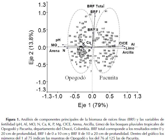 El ACP mostró que los dos primeros componentes fueron significativos y explicaron el 92.8 % de la varianza de los datos. Las condiciones edáficas (textura, pH, N total y MO) tuvieron alta correlación entre sí y diferenciaron claramente las parcelas de Opogodó de las de Pacurita. Sin embargo, la BRF (total y en las dos profundidades) presentó poca relación con las variables edáficas (Figura 1).