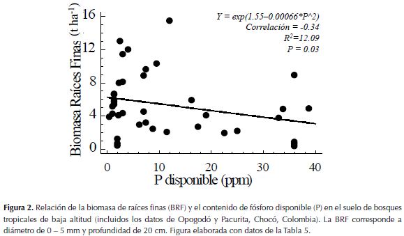 Contrario a lo anterior, al analizar la relación entre la BRF y el contenido edáfico de P disponible a escala regional (bosques tropicales de baja altitud) se denotó una relación significativa e inversamente proporcional entre las variables (Figura 2), lo cual corrobora la hipótesis de la disminución de la BRF en suelos con mayor contenido de nutrientes, como lo reportaron Gower (1987), Maycock & Congdon (2000), Powers et al. (2005), Espeleta & Clark (2007) y Kochsiek et al. (2013). Finalmente, basados en la hipótesis de Gower (1987) que considera que la BRF es controlada por nutriente(s) mineral(es) limitante(s) en el ecosistema forestal, el presente estudio aporta evidencias para considerar al P disponible como uno de los nutrientes más limitantes de los bosques tropicales a escala regional.