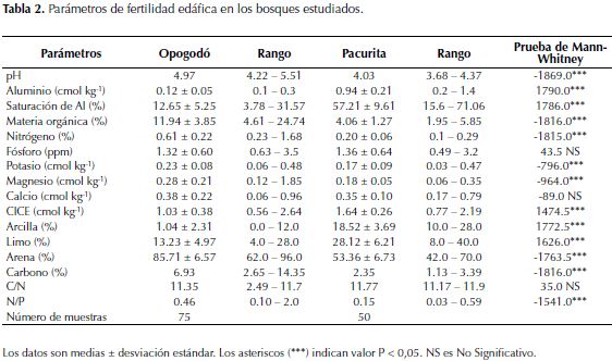 Los suelos estudiados son extremadamente ácidos; con mayor acidez y porcentajes altos de saturación de Al en la localidad de Pacurita (Saturación de Al = 57.21%). Se presentaron concentraciones altas de MO y N, con los mayores registros en Opogodó (MO = 11.94%; N = 0.61%). Las cantidades edáficas de P, Mg, y Ca fueron muy bajas, mientras que los valores de K fueron intermedios; así mismo, la CICE fue baja en las dos zonas. Las concentraciones de P y Ca fueron muy similares en las dos localidades; sin embargo, el resto de los parámetros de fertilidad presentaron diferencias estadísticamente significativas (Tabla 2). Por lo tanto, basados en la menor acidez, altas concentraciones de MO y N, y en los valores intermedios de K, se considera que los suelos de Opogodó son más fértiles que los de Pacurita.