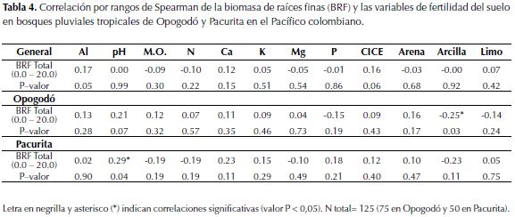 Al analizar los datos de las dos localidades en conjunto se observó que la BRF no presentó correlación significativa con los parámetros edáficos evaluados. El análisis individual en cada localidad mostró correlaciones significativas con algunas variables edáficas, pero muy débiles: en Opogodó la BRF presentó correlación negativa con la arcilla, mientras que en Pacurita la BRF presentó correlación positiva con el pH.