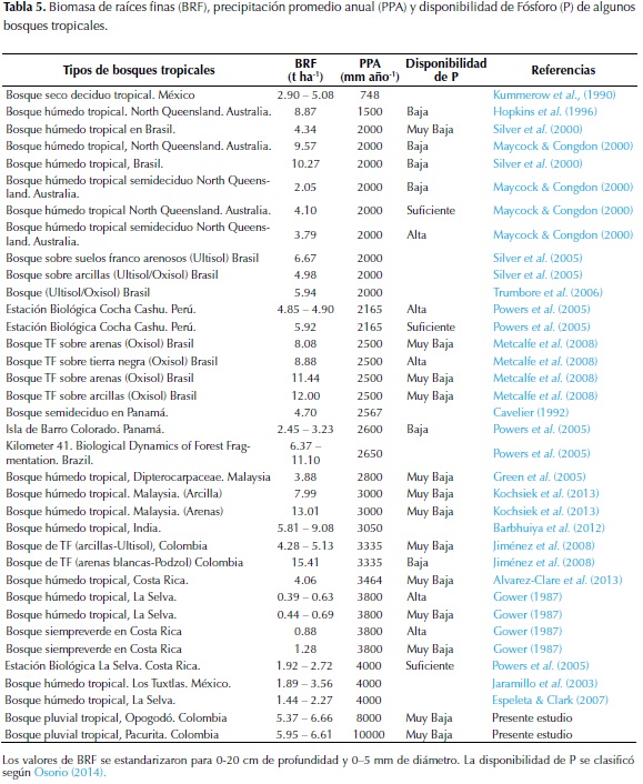 La BRF registrada entre 0 y 20 cm de profundidad, en suelos arenosos de los bosques pluviales tropicales de Opogodó y en suelos arcillosos de Pacurita, se encuentra dentro de los rangos reportados en bosques tropicales de tierras bajas con valores de entre 3 - 120 t ha-1 (Vogt et al., 1985). Nuestros resultados fueron similares a los registrados en otros bosques tropicales de baja altitud con diferentes regímenes de precipitación en Australia (Maycock & Congdon 2000), Brasil (Silver et al., 2000; 2005), Perú (Powers et al., 2005), Colombia (Jiménez et al., 2008), India (Barbhuiya et al., 2012), Costa Rica (Alvarez-Clare et al., 2013) y Malaysia (Kochsiek et al., 2013); así como también a los registrados en bosques semideciduos de Panamá (Cavelier, 1992) y en bosques secos de México (Kummerow et al., 1990) (Tabla 5). El hecho de que estos bosques tropicales con diferentes niveles de precipitación presenten una BRF similar, muestra que otros factores como la disponibilidad de nutrientes (por ejemplo el P disponible - Figura 1) (Gower, 1987; Maycock & Congdon, 2000; Espeleta & Clark, 2007), textura (Silver et al., 2000; 2005; Jiménez et al., 2008; Kochsiek et al., 2013), material parental (Espeleta & Clark, 2007), tipo de vegetación y área basal (Finér et al., 2011), entre otros, podrían tener un mayor efecto sobre la BRF en comparación con la precipitación anual. Al respecto, Finér et al., (2011), afirman que factores como temperatura, precipitación promedia anual, latitud y altitud, explican muy poco las variaciones en la BRF de los bosques tropicales.