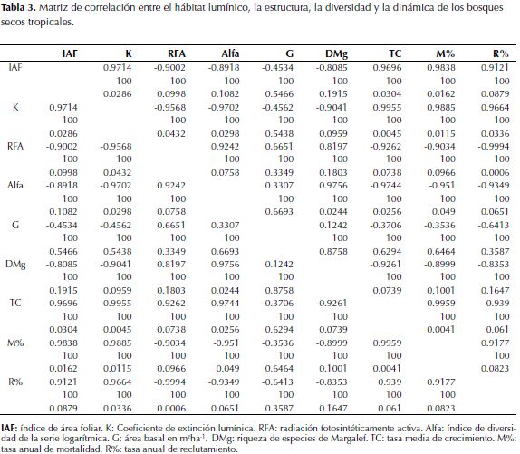 La tabla 3 caracteriza el hábitat lumínico y lo vincula con la estructura, la diversidad y la dinámica del bosque a partir de una matriz de correlación, para los parámetros índice de área foliar (IAF), Coeficiente de extinción lumínica (K), radiación fotosintéticamente activa (RFA), índice de diversidad de la serie logarítmica (Alfa), área basal en m2ha-1 (G), riqueza de especies de Margalef (DMg), tasa media de crecimiento (TC), tasa anual de mortalidad (M) y tasa anual de reclutamiento (R). Se observan altos valores de correlación entre el IAF, que expresa la magnitud de la cobertura del dosel y el papel en la captura y absorción de radiación, frente a la diversidad florística, las tasas de crecimiento medio, la mortalidad y el reclutamiento. Los valores negativos en la correlación con la diversidad indican que en bosques con doseles que tienen gran superficie foliar (IAF) para capturar la poca disponibilidad de RFA. La riqueza de especies es baja. Sotobosques más iluminados permiten el establecimiento de más especies por unidad de área y hay más heterogeneidad de nichos de crecimiento. Igualmente, se detectó correlación negativa entre el IAF y la supervivencia de la comunidad arbórea. El área basal tiene baja correlación con el hábitat lumínico debido principalmente a la influencia de los grandes árboles del BRM que comparten el mismo hábitat de árboles de menores dimensiones de los bosques secundarios. La mortalidad correlaciona en forma positiva con el IAF y K, caso contrario con RFA. El reclutamiento tiene una tendencia similar.