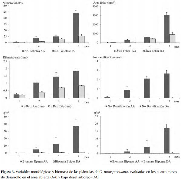 En las etapas iniciales de desarrollo los factores de luz, nutrientes y agua son fundamentales para el crecimiento de las plántulas (Baruch y Fisher, 1991), siendo los altos niveles de radiación lumínica en leguminosas el factor relacionado con la sobrevivencia y el vigor de la planta (Romo, 2005; Pavón et al., 2011; Vega et al., 2011). Dado que la disponibilidad de energía por radiación lumínica en el área abierta es mayor, los individuos de G. monspessulana la orientan al incremento del área foliar y formación de mayor número de foliolos. De igual manera, hay engrosamiento de las estructuras de soporte, generando raíces secundarias y múltiples vellosidades radiculares. Este tipo de inversión no se observó en los individuos bajo el dosel arbóreo lo que los hace más susceptibles a pequeños disturbios probablemente incrementando la mortalidad.