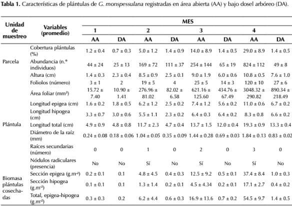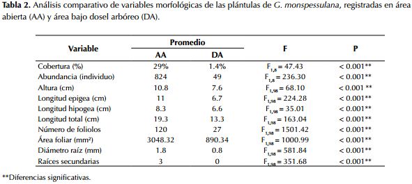 Los individuos de G. monspessulana presentaron diferencias morfológicas en los diferentes periodos de desarrollo y entre las dos áreas evaluadas. Las principales diferencias se evidenciaron al cuarto mes de desarrollo en el crecimiento en altura, presencia de nódulos y mayor engrosamiento de las estructuras de soporte y anclaje en el sitio abierto comparado con el área con cobertura arbórea. La regeneración de individuos de G. monspessulana fue mayor en el área abierta que en el área con cobertura arbórea (tabla 2).
