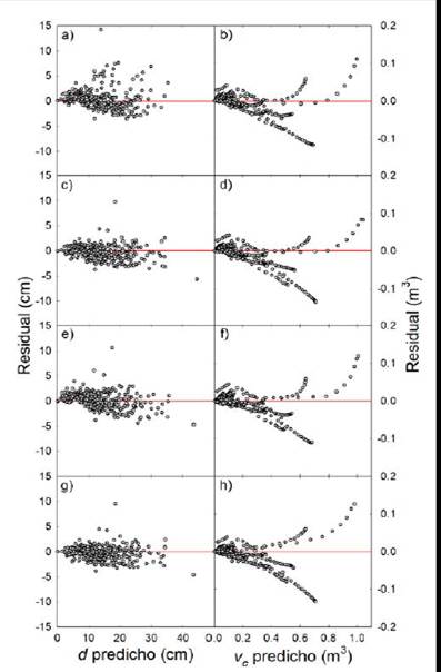 Para la predicción de diámetros fustales se encontró que los sistemas 2, 3 y 4 no presentan diferencias notables en la distribución de sus residuales, los cuales tienden a una distribución normal. El sistema 1 presenta residuales con distribución heterogénea en el rango de valores predichos (figura 1a). Para la predicción de volúmenes comerciales se observan patrones de comportamiento en los residuales similares entre los modelos evaluados (figura 1b, d, f y h). Entre los cuatro sistemas de ecuaciones evaluados sobresale el sistema 4, con residuales sin ninguna tendencia y distribuidos homogéneamente a lo largo de los valores predichos ( figura 1). Los residuales generados en la predicción de volúmenes comerciales tienden a aumentar a medida que el tamaño del árbol aumenta, este comportamiento es típico en los modelos de volumen total.
