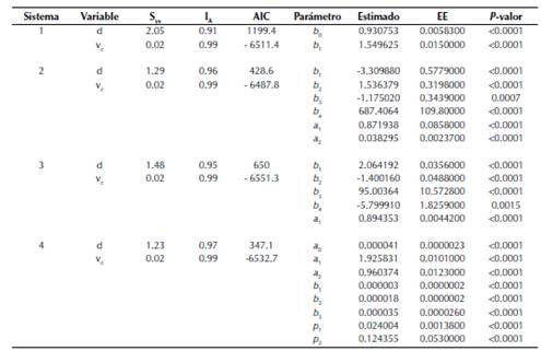 La bondad de ajuste de los sistemas de ecuaciones fue evaluada considerando el error estándar de estimación (Syx),