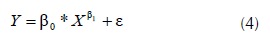 Ajuste, selección de modelos y estimaciones. Se observaron las relaciones de las variables AFT y BFT con las variables dendrométricas medidas, esto es DAP y h, además de sus transformaciones. Se ajustaron modelos de regresión del tipo lineal simple (método de los mínimos cuadrados) y no lineal (método de estimación de Marquardt), representados por las ecuaciones 3 y 4, respectivamente.