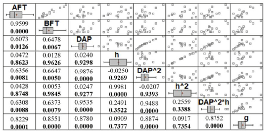 Relación entre las variables. Para los 16 individuos seleccionados el AFT varió entre 9.73 y 56.1 m2, en tanto el BFT entre 0.52 y 4.11 kg. La matriz de correlación entre las variables (Figura 1), muestra que el área basal (g) presentó la mayor correlación tanto con la variable AFT (r = 0.8229) como BFT (r = 0.8551), superando al DAP y sus transformaciones. La altura (h) no tuvo relación con AFT y BFT con r = 0.0472 y r = 0.0128, respectivamente; además, al combinarse con el DAP la relación decreció en ambas variables dependientes. En consideración a lo anterior, el ajuste se realizó haciendo uso del área basal.