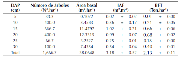 La tabla de rodal que caracteriza el rodal muestreado y las estimaciones de IAF y BFT corresponde al promedio de los modelos testeados (tabla 1). Para las clases diamétricas de 10 a 30 cm se usaron 3 árboles, mientras que para la de 5 cm se utilizó un único árbol.