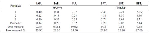A partir de los resultados obtenidos, en cada una de las tres parcelas se realizó una estimación por hectárea, amplificando el valor encontrado en cada una, tanto para IAF como BFT (tabla 3). Las estimaciones fueron muy similares, aunque la estimación con el modelo lineal sin el parámetro β 0 es la más conservadora; no obstante, tiene el mayor error muestral porcentual (28.2 %).