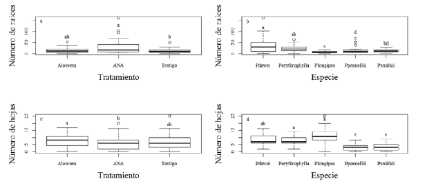 Figura 1 Número de raíces por tratamiento (a) y especie (b), y número de hojas por tratamiento (c) y especie (d). Letras no compartidas representan diferencias a un nivel de significación de 0.05.