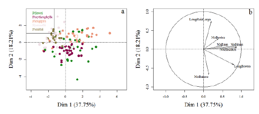 Figura 2 Análisis de componentes principales para las variables medidas en las estacas. Se presentan los individuos de cada especie (a) y las variables (b) sobre el plano factorial. LongBrotes: longitud del brote más largo (cm), LongRaizLarga: longitud de la raíz más larga (cm), NoBrotes: número de brotes, NoHojas: número de hojas, NoRaices: número de raíces, NoRam: número de ramificaciones en una muestra de raíz de 3 cm y NoZarcillos: número de zarcillos.