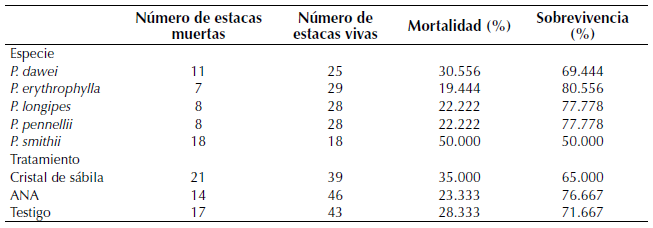 No se encontraron diferencias entre el porcentaje de sobrevivencia y mortalidad de las estacas entre las especies (sobrevivencia K-W x 2 : 4, p-valor: 0.406; mortalidad K-W x 2 : 4, p-valor: 0.406) o entre los tratamientos (sobrevivencia K-W x 2 : 2, p-valor: 0.368; mortalidad K-W x 2 : 2, p-valor: 0.368). Sin embargo, las estacas con mayor mortalidad correspondieron a las especies P. dawei y P. smithii y aquellas que fueron tratadas con cristales de sábila (tabla 2).