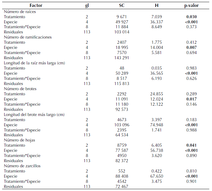 Tabla 3 Resultados de la prueba Scheirer-Ray-Hare para las variables medidas sobre las estacas de Passiflora. gl: grados de libertad, SC: suma de cuadrados, H: valor para el estadístico de prueba. En negrilla los valores significativos a un nivel de 0.05.