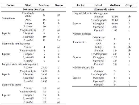 Aunque no hubo diferencias significativas entre los tratamientos, el número de raíces por estaca fue mayor cuando se aplicó ANA en comparación con la aplicación de cristales de sábila y el testigo, y no hubo una diferencia significativa en el número de raíces por estaca para las que fueron tratadas con cristales de sábila (Aloe vera) y las testigos (figura 1a). En cuanto a la especie, P dawei y P erytrophylla reportaron las producciones más altas de raíces en comparación con P. longipes, la cual presentó la menor cantidad de raíces (figura 1b).