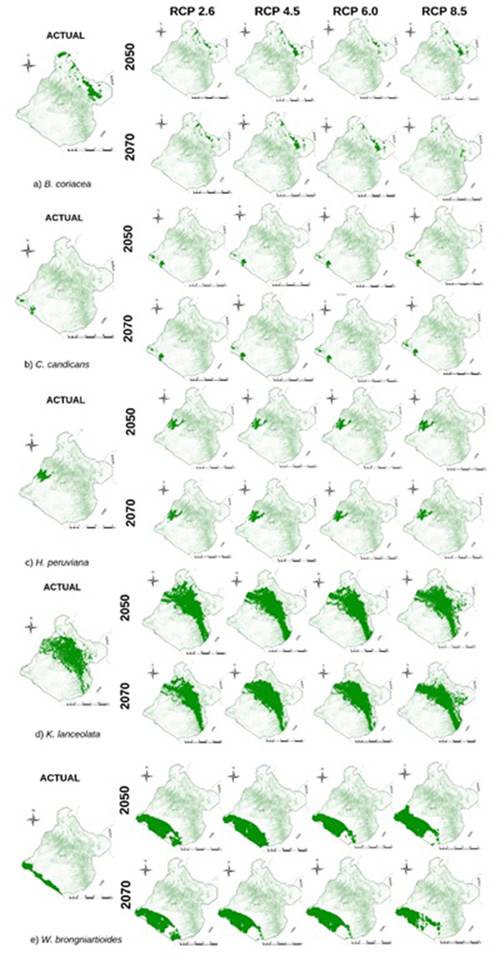 Se obtuvieron nueve modelos de nicho ecológico para cada especie (el modelo actual más cuatro proyectados al año 2050 y para el 2070), conformando así un total 45 archivos raster del tipo ASCI que contenían la distribución geográfica de los nichos ecológicos de las cinco especies, tanto para la actualidad como para los cuatro RCP proyectados. En la tabla 2 se presentan los resultados de cobertura actual del nicho ecológico y el porcentaje de pérdida o ganancia de cobertura en el RCP proyectado. Allí se observa que solo la especie B. coriacea tendrá pérdidas de superficie de nicho ecológico en todos los RCP proyectados al 2050 y 2070; mientras que C. candicans y W. brongniartioides presentan ganancia de superficie en todos los escenarios evaluados. H. peruviana demuestra pérdida de superficie de su nicho ecológico en los tres primeros escenarios del 2050, pero a partir del RCP8.5 estos tienden a volverse positivos (ganancia), mientras que K. lanceolata también presenta ganancia en todas las proyecciones RCP. En la misma tabla 2 se presentan los resultados de la prueba de Jakknife, resaltándose a aquella variable que aporto mayor información al modelamiento de los nichos ecológicos por especie. Se evidencia que predominan las variables bioclimáticas, en especial las de precipitación.