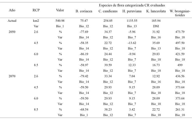 Con respecto a los nichos ecológicos obtenidos para las especies de flora silvestre categorizada que se distribuyen a menor altitud (de 0 a 2000 metros) que habitan zonas desérticas, costeras y de lomas, como C. candicans (75.47 km2), H. peruviana (254.05 km2) y W. brongniartioides (185.94 km2), sus superficies tienden a mantenerse e incrementarse incluso en los RCP proyectados al año 2050 y 2070 como se muestra en la figura 3. En estas se observa que no se verán afectadas por las nuevas condiciones climáticas de los RCP futuros, lo que estaría asociada a sus ciclos vegetativos. Aunque Leiva, Galloso y Chang (2016) describieron a C. candicans como especie psicrófila (crece en lugares fríos), heliófila (requiere abundante luz del sol), higrófila (prefiere suelos húmedos, tierras negras con abundante humus), psamófila (puede desarrollarse en suelos arenosos, pedregosos) y argilícola (prospera en suelos arcillosos); aunque, por lo general, es una especie eutrofa que prefiere suelos con abundantes nutrientes. Esto también hace suponer que su categoría de amenaza CR se debe principalmente a la frecuente actividad antropogénica establecida en esta parte del país que el PNUD (2018) identifica como minería desregulada, invasiones de terrenos para viviendas, el tráfico de terrenos y el pastoreo no regulado de ganado.