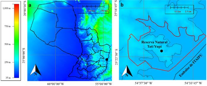 El estudio se realizó en una parcela permanente de monitoreo instalada en la Reserva Natural Tati Yupi (25°22’1.8” latitud sur - 54°36’10.7” longitud oeste), la cual se encuentra en una zona periurbana del municipio de Hernandarias, departamento de Alto Paraná, Paraguay, y colinda con el embalse de Itaipu Binacional (figura 1). La altitud del terreno oscila entre los 220 y 260 m y presenta una temperatura media anual de 22 °C y una precipitación media anual de 1870 mm (Itaipu, 2016). El clima está clasificado, según Köppen, como templado lluvioso (Cfa) y, de acuerdo con el sistema de Thornthwaite, como Húmedo B2 (Itaipu, 2016). En la zona domina el suelo del orden Oxisol: de color pardo rojizo y textura limo arcillosa (Vera, 2009). La Reserva Natural Tati Yupi es una de las áreas núcleo de la Reserva de Biosfera de Itaipu, que fue reconocida por el programa Hombre y Biosfera de la Unesco en el año 2017.