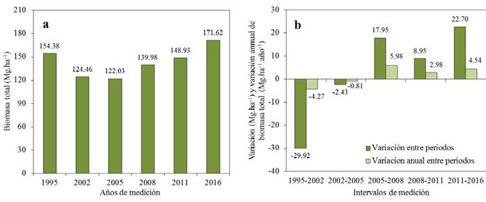 La mayor disminución de biomasa total se registró en el periodo 1995-2002, con una reducción de 29.96 Mg.ha-1 que equivale a 4.28 Mg.ha-1.año-1 (figura 2b). A partir del 2005 hasta el 2016 se registró un aumento gradual de biomasa total. En el periodo 2005-2008 se produjo el mayor incremento anual de biomasa (6.00 Mg.ha-1.año-1).