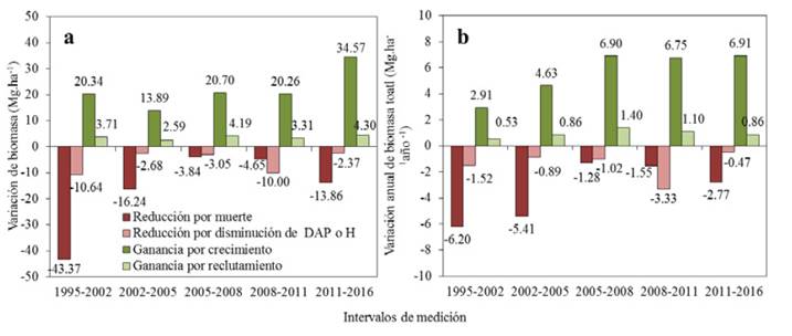 En todos los periodos, la ganancia de la biomasa total debido al crecimiento de individuos fue superior al incremento por reclutamiento. Mientras que la reducción de biomasa total por la muerte de individuos fue superior a la reducción debido a la disminución del DAP o altura total, a excepción del periodo 2008-2011 (figuras 3a y 3b).
