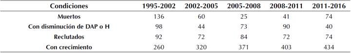 Tabla 1 Número de árboles vivos, muertos, con disminución de DAP o altura (H), reclutados y con crecimiento registrados en cada medición (ind.ha-1)