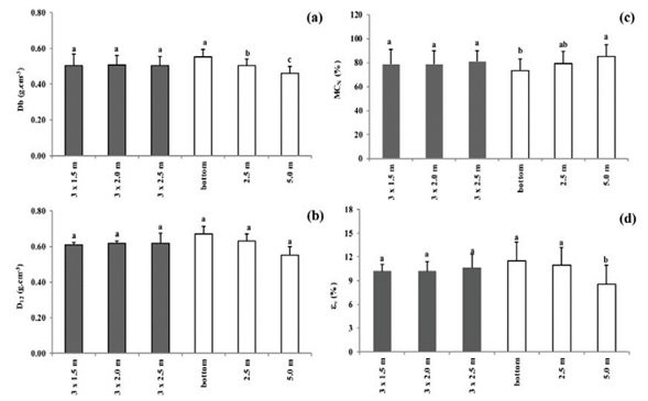 Figure 1 a) Basic density (Db), b) apparent density (ρ12), c) natural moisture content (MCN), and d) volumetric shrinkage (εv) as a function of tree spacing and longitudinal variation of 38-year-old Cariniana legalis. *Average values followed by the same distinct letters in columns of the same color differ by Tukey’s test (p<0.05)